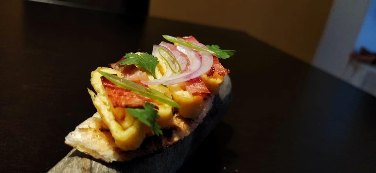 Sobre los trozos de arepa colocamos dos rollitos de huevo, la tocineta tostada y decoramos con un poco de cilantro, una plumas de cebolla morada y también un poco de cebolla de rama en corte sesgado.