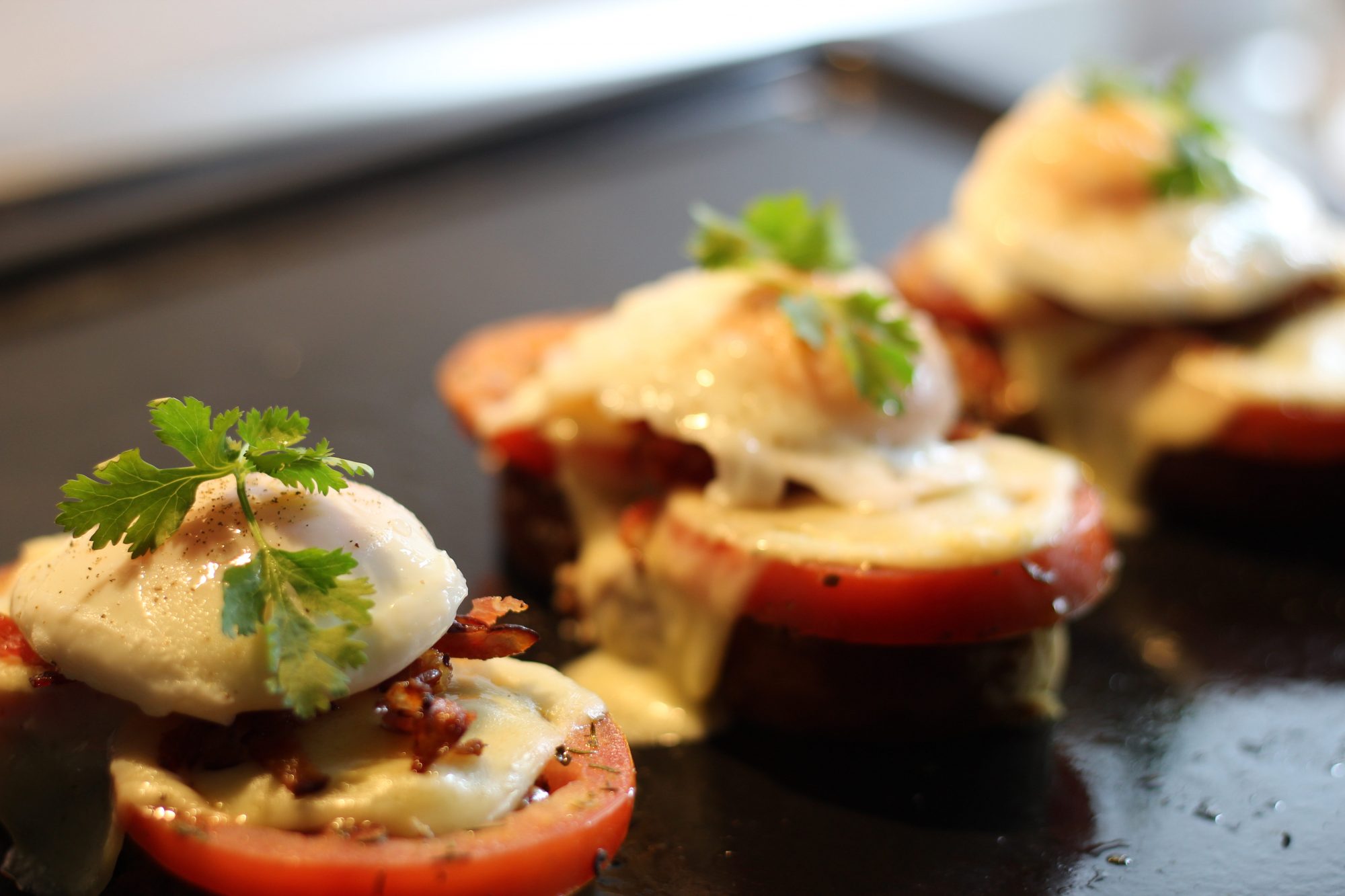 Sobre el pan coloca dos rodajas de tomate, luego el queso mozzarella o el de tu preferencia. Llevalo al horno tostador hasta que el queso se derrita. Ahora, haz un pequeño nido en el centro con la tocineta dorada y termina con el huevo pochado justo encima.