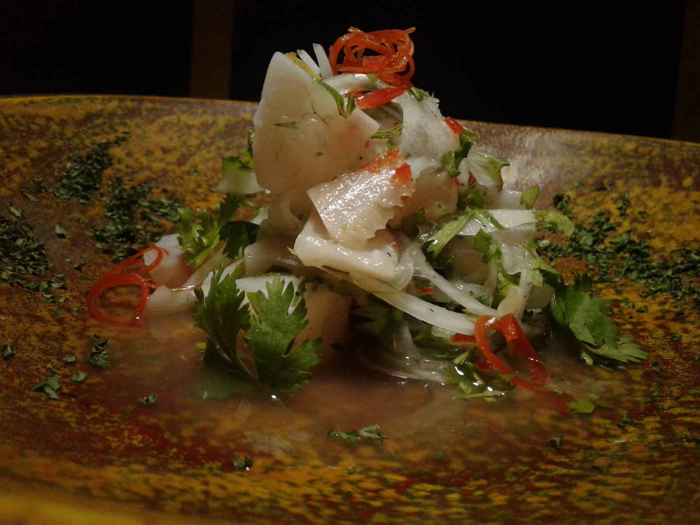 En un bowl colocamos el pescado cortado en cubos pequeños, no demasiado porque podría deshacerse, añadimos el jugo de cinco limones, cebolla morada cortada en plumas, cilantro picado finamente, el ají cortado finamente, media taza de leche de coco sal y pimienta. Revolvemos muy bien y reservamos.